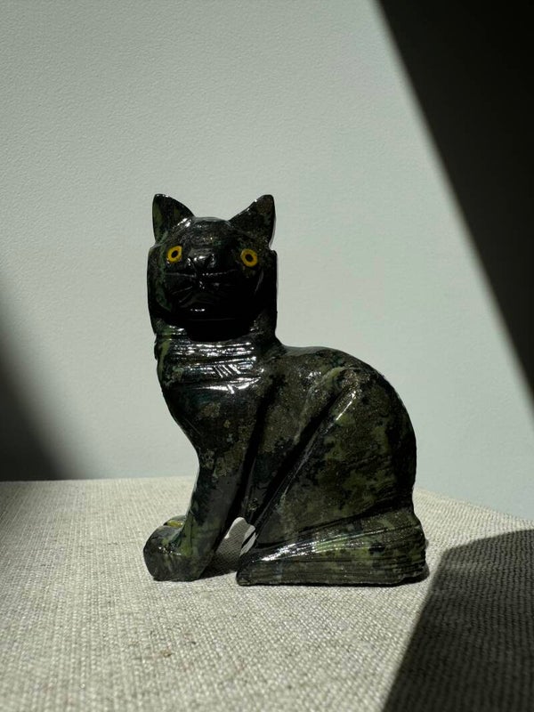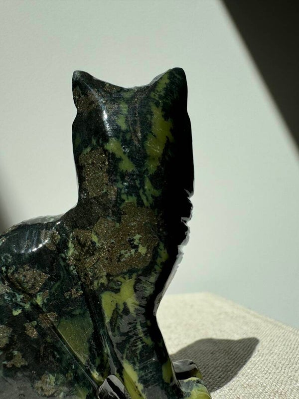 Take a closer look and you will find there are some Pyrite inclusion in this gorgeous Serpentine Cat, what a beautiful combo!