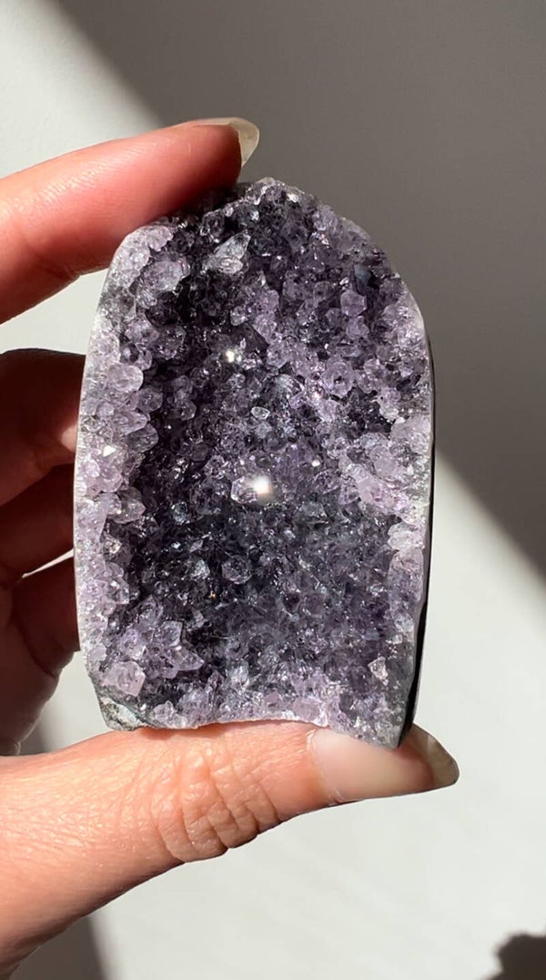 Perfectly sized for any space, this mini geode adds a touch of elegance and positive energy to your home or office. Display it on your desk, shelf, or bedside table to enjoy the tranquil and harmonizing vibes that Amethyst is believed to bring.