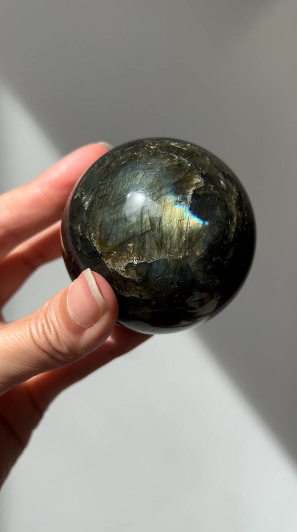 Introducing our mesmerizing Labradorite Sphere with a captivating play of colors. This exquisite crystal ball showcases a strong flash of iridescence, making it a stunning addition to any collection. Labradorite is renowned for its mystical and transformative properties, making this sphere not only visually striking but also a powerful tool for spiritual growth.