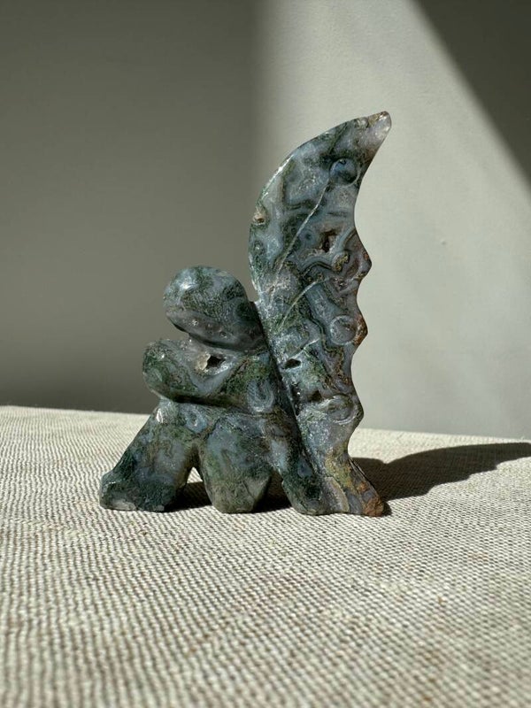 This adorable fairy is crafted from druzy moss agate, showcasing the natural patterns and earthy hues inherent in this beautiful gemstone. Be sure to take a closer look and you will discover different small pockets of druzy on this fairy!